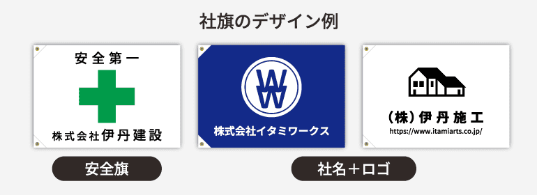 社旗のデザイン例です。お客様のお好きなデザインでオリジナルの社旗を制作することができます。