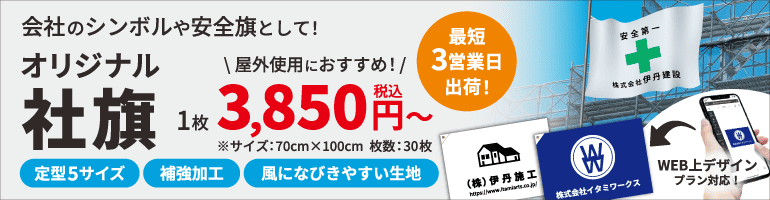 現場シートキングでは、1 枚 3,850 円(税込)※~、最短 3 営業日(特急便)でオリジナルの社旗が制作できます!