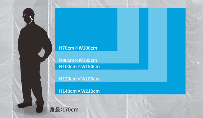 壁面や小さい工事現場にはH70cm×W100cm、インパクトを与えたい場合は大きめサイズのH120cm×W180cmやH140cm×W210cmがおすすめです。